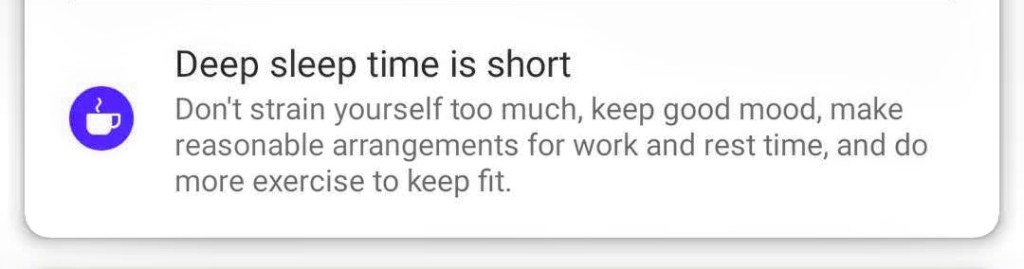 Now let’s move on to the sleep tracking. The sleep tracking gets a lot right. What it tells me about when I go to sleep, when I wake up, and how long I slept for is in line with my personal observations. It also shows me the different phases of sleep I went through in the night, and some “tips” to improve my sleep quality. One of the recurring tips it keeps showing me is that I should get more “deep sleep”. Now, I have always been a light sleeper, but I always felt like I got a good night’s sleep more often than not. Except now this fitness band comes along and tells me that I don’t get enough “deep” sleep even though I slept for a good 7 to 8 hours. Have I been wrong all along? Have I never truly had proper sleep in my entire life? Is that a problem I didn’t know I had? The gaslighting is taking hold now.